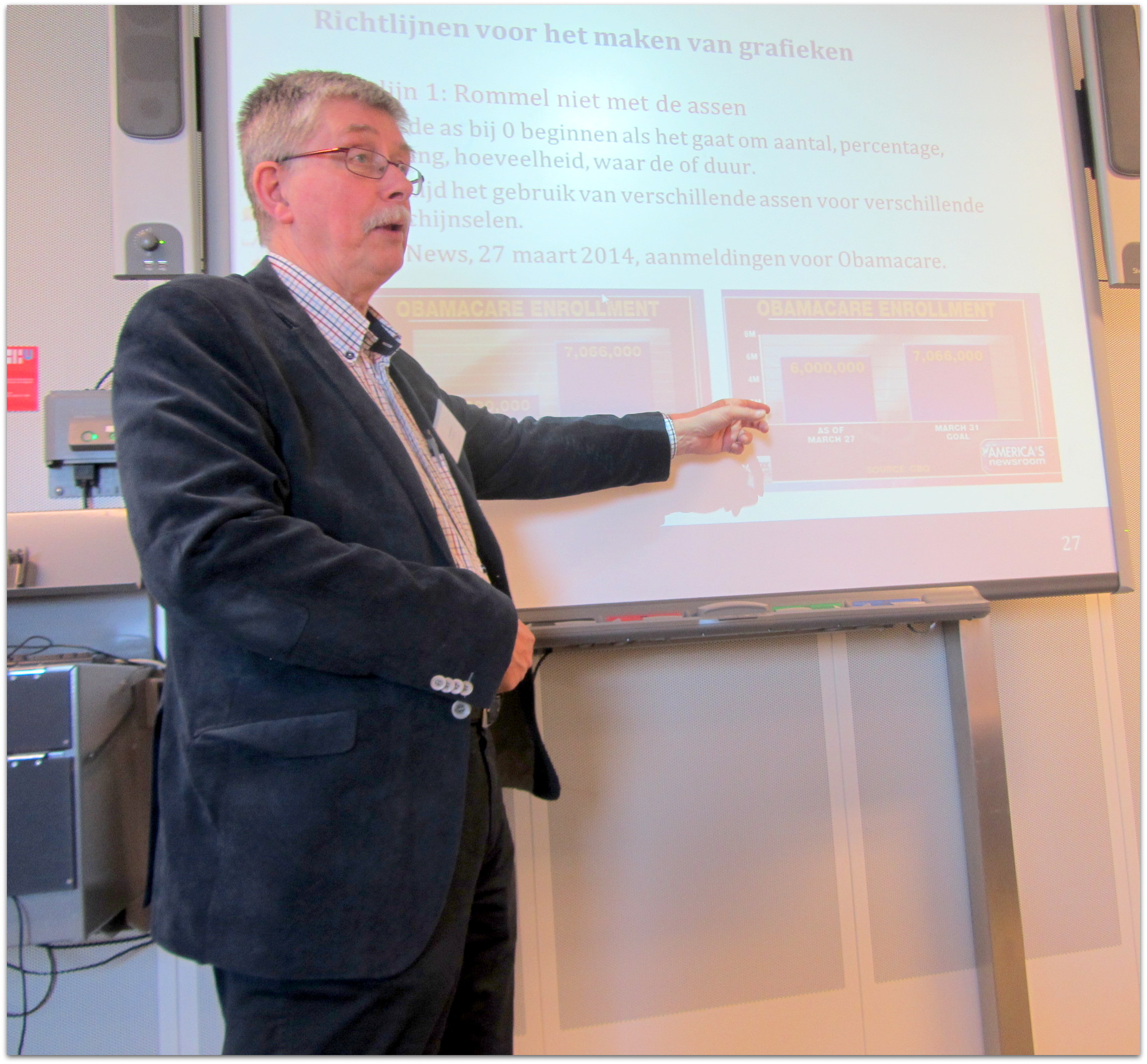 Het aantal aanmeldingen voor Obamacare (zorgprogramma) bleek heel anders dan gesuggereerd door een grafiek met een foute X-as. Dit is nadien gecorrigeerd onder druk van een storm aan protest. Iets dergelijks presteerde Gijs Rademaker met resultaten van het Opiniepanel rond verkiezingen. Een rapport over het wel en wee van grafieken kan worden gedownload van: www.peilingpraktijken.nl